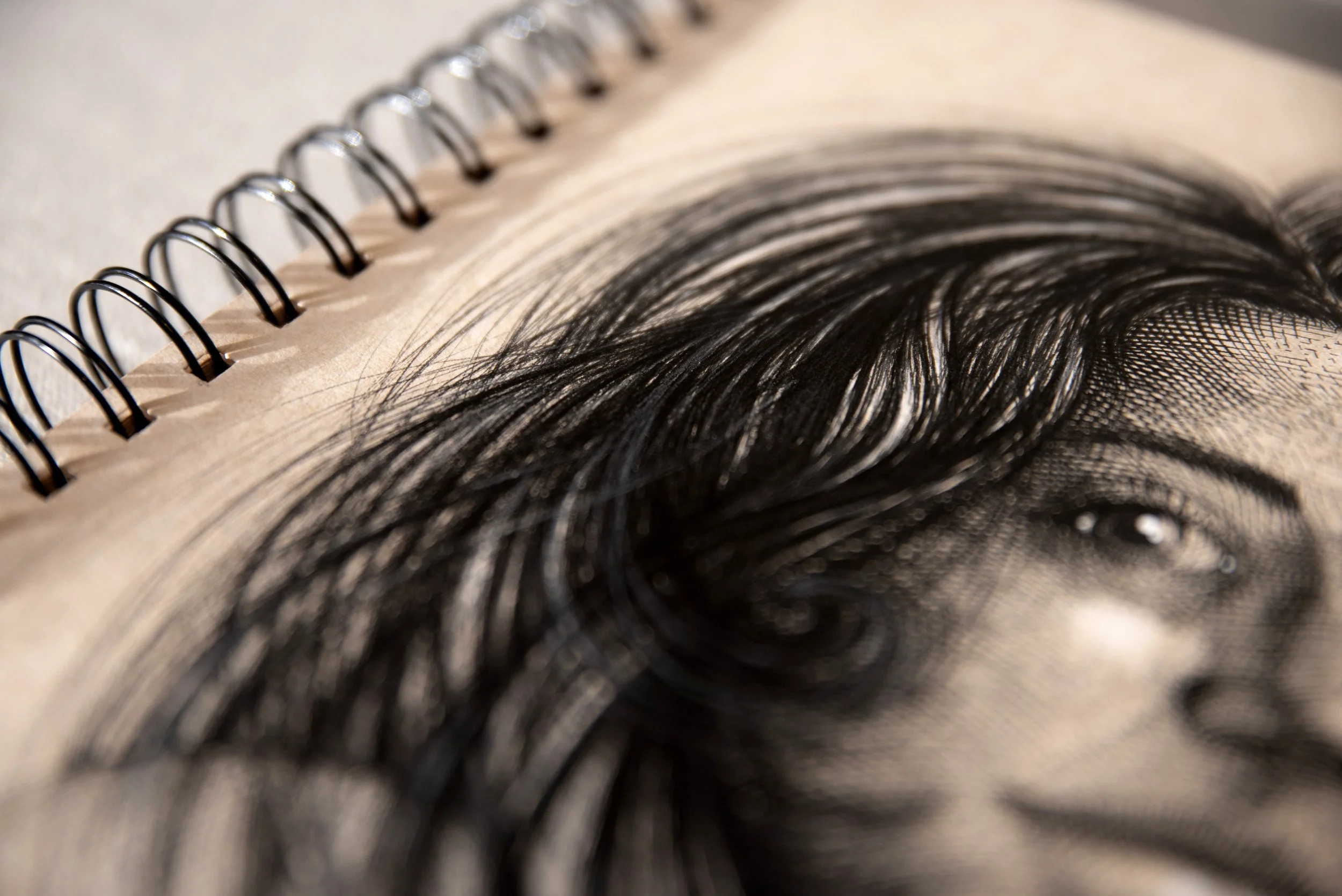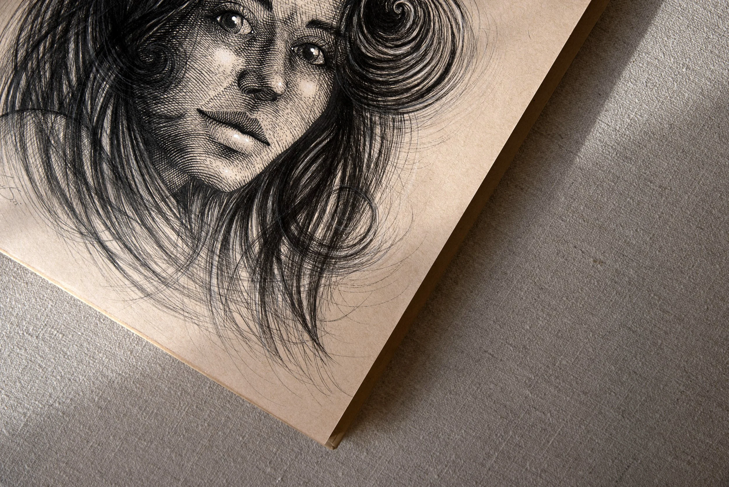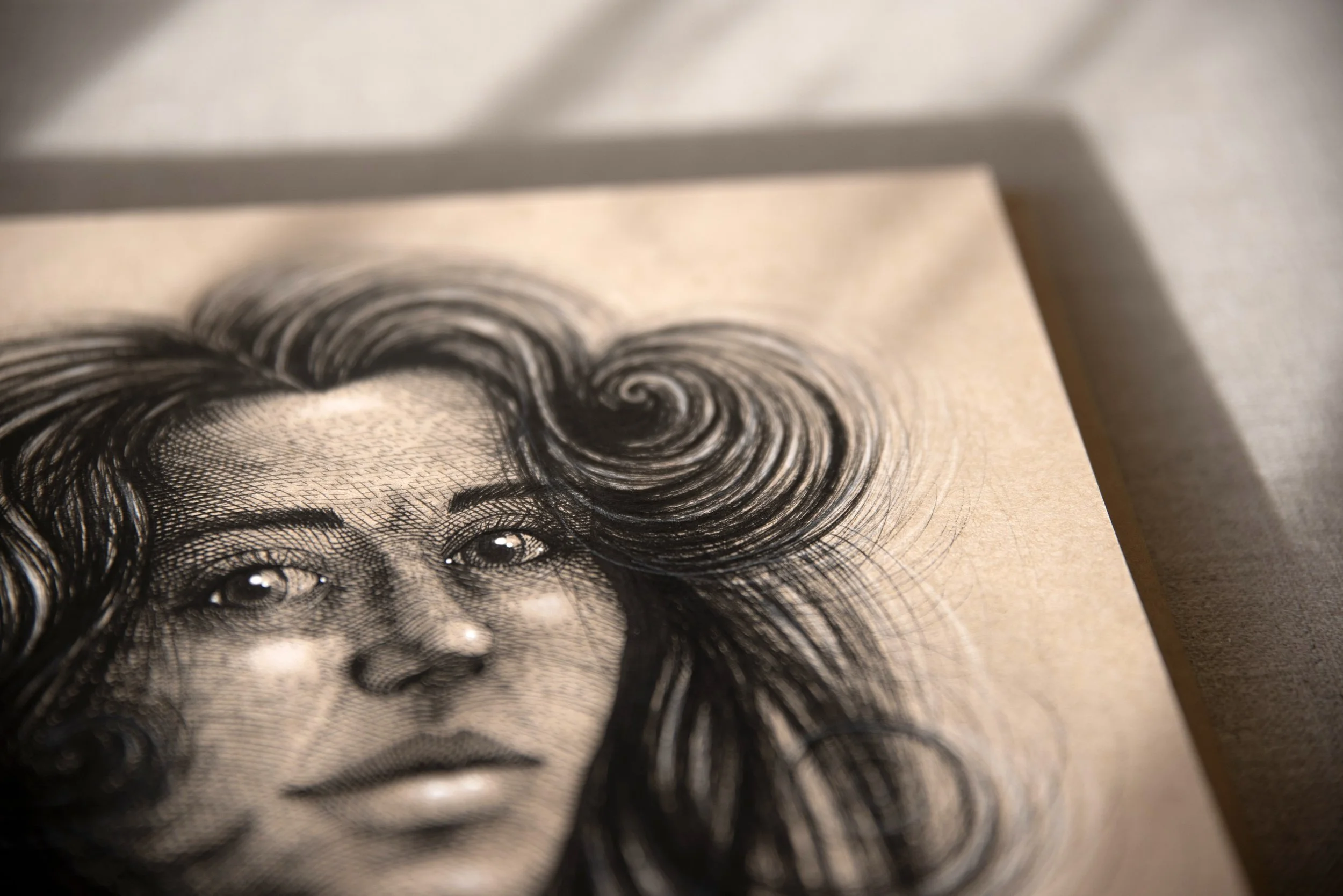 Illustration style gravure.Le résultat d’un workshop sur l’illustration aux traits de style gravure à l’ancienne. Ce portrait a été réalisé en médium traditionnel à l’encre noir et petites touches de crayon blanc.