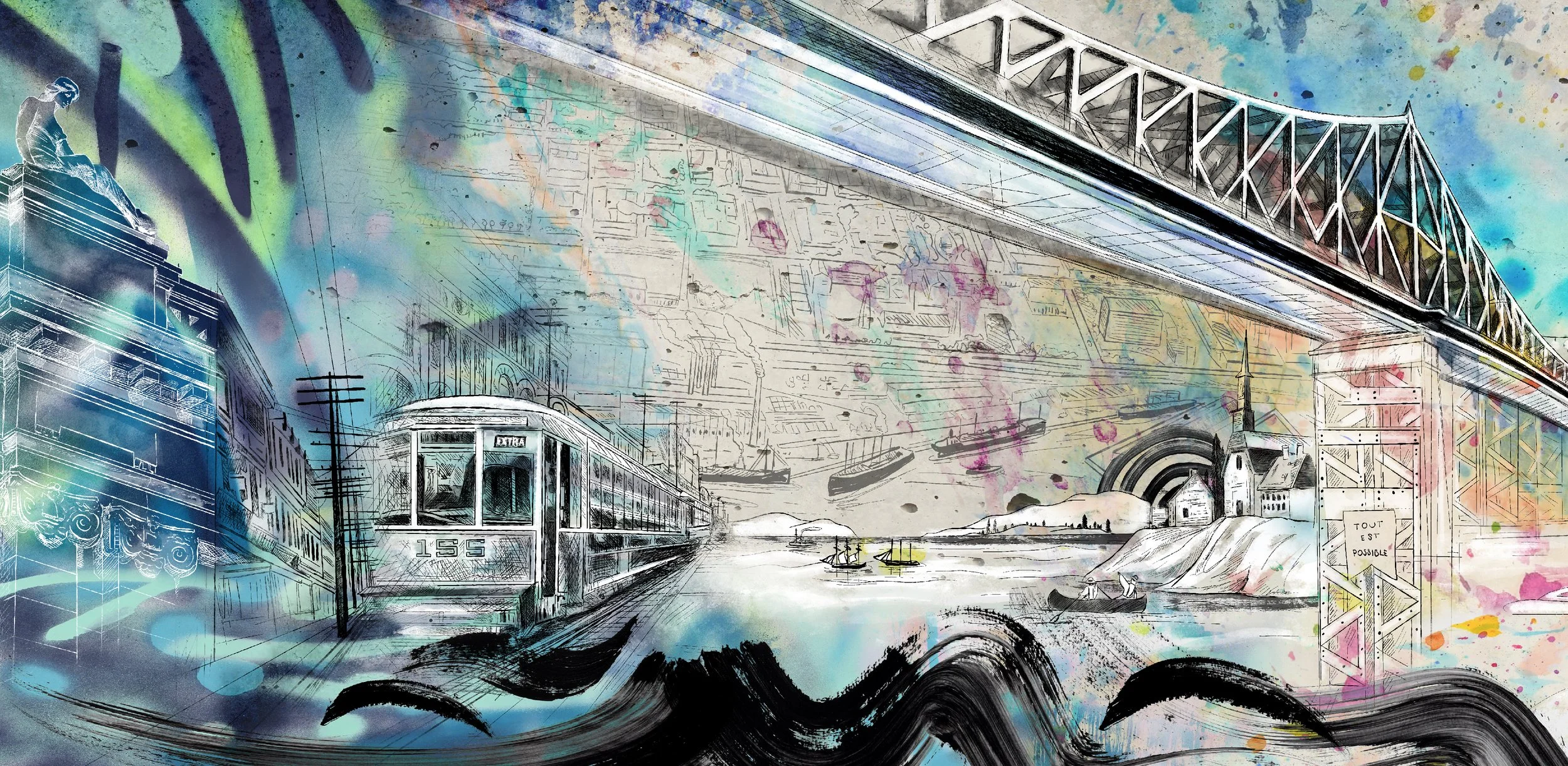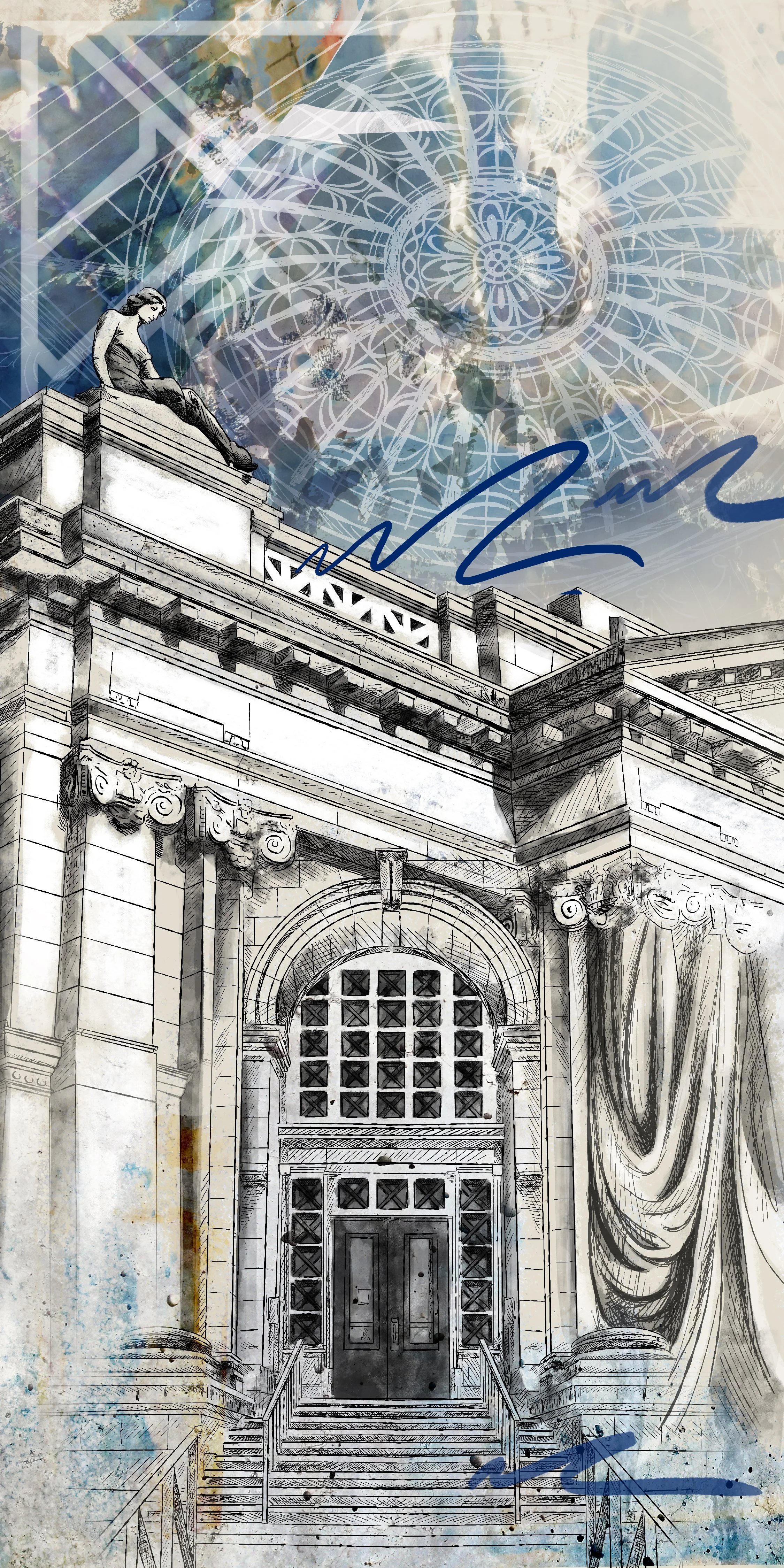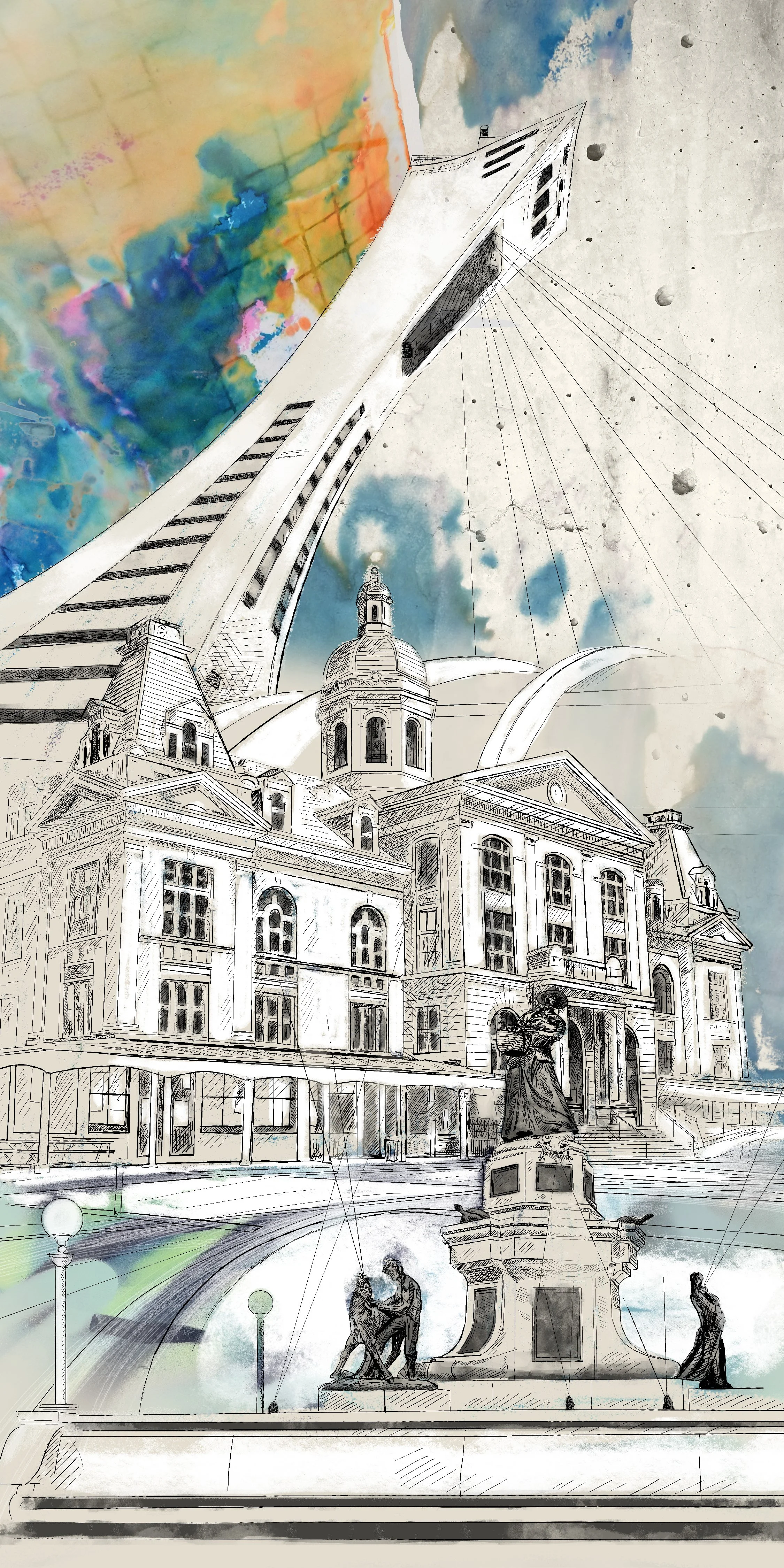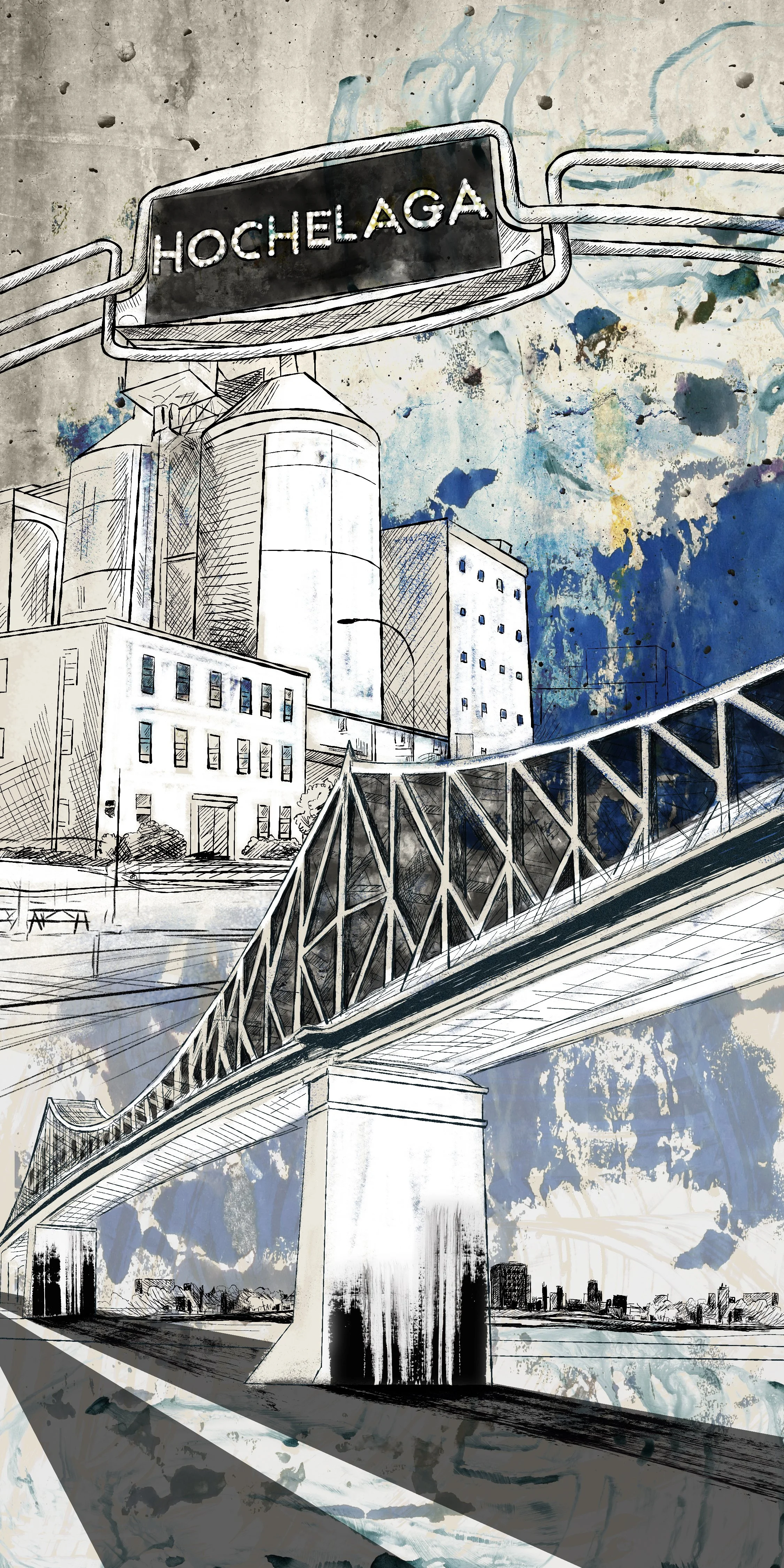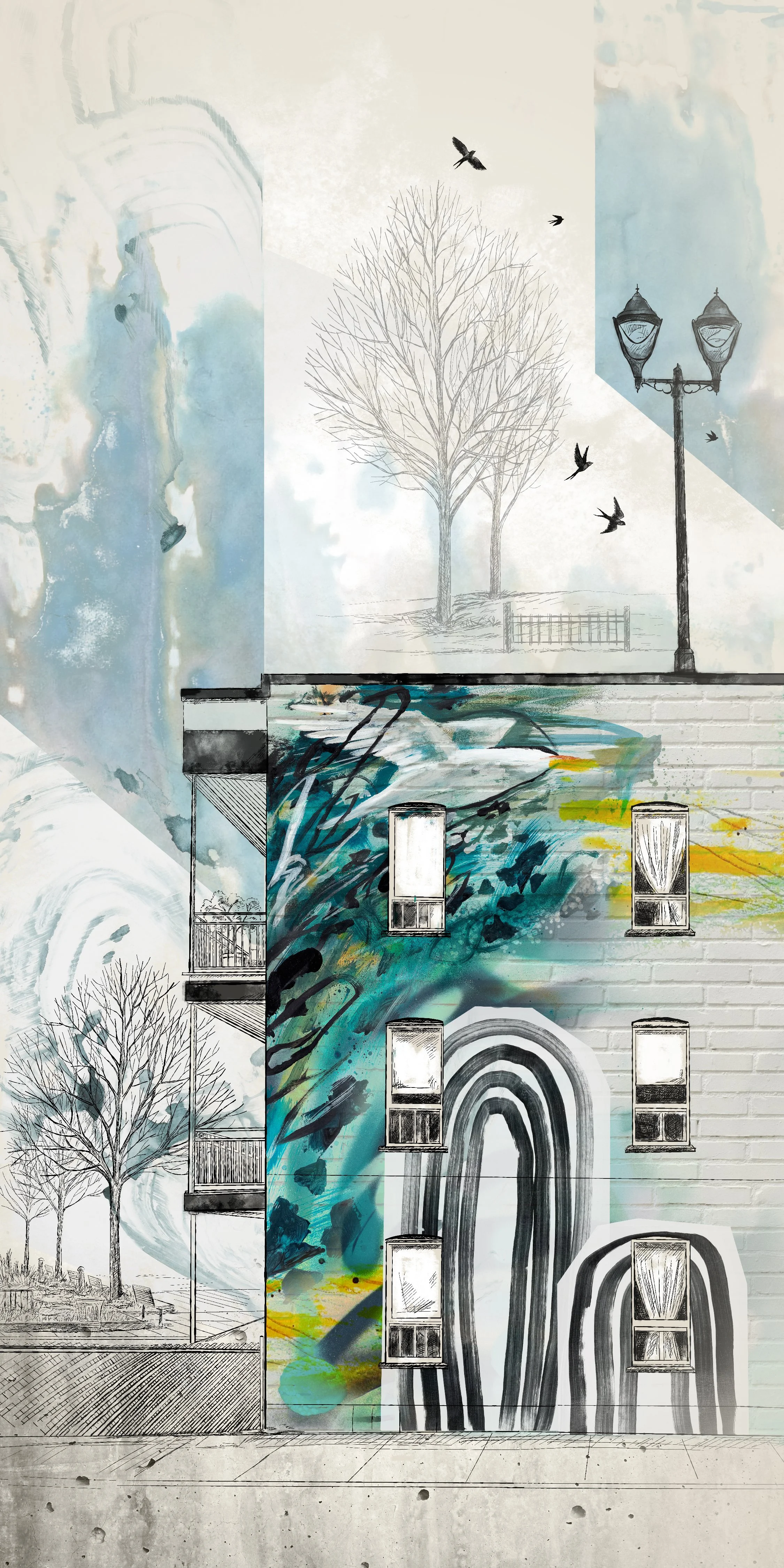 Karine Chartrand et moi avons travaillé ensemble pour la création des ces oeuvres. Karine a réalisée toute la couleur avec ses magnifiques motifs et taches alors que j’ai créé les éléments architeuraux et autre en noir et blanc. Mes images d’origine ont été réalisées en numérique puis, nous avons assemblé le tout dans photoshop. Les oeuvres ont ensuite été imprimées sur toile et sur support murale et installées au Mostra Montréal.