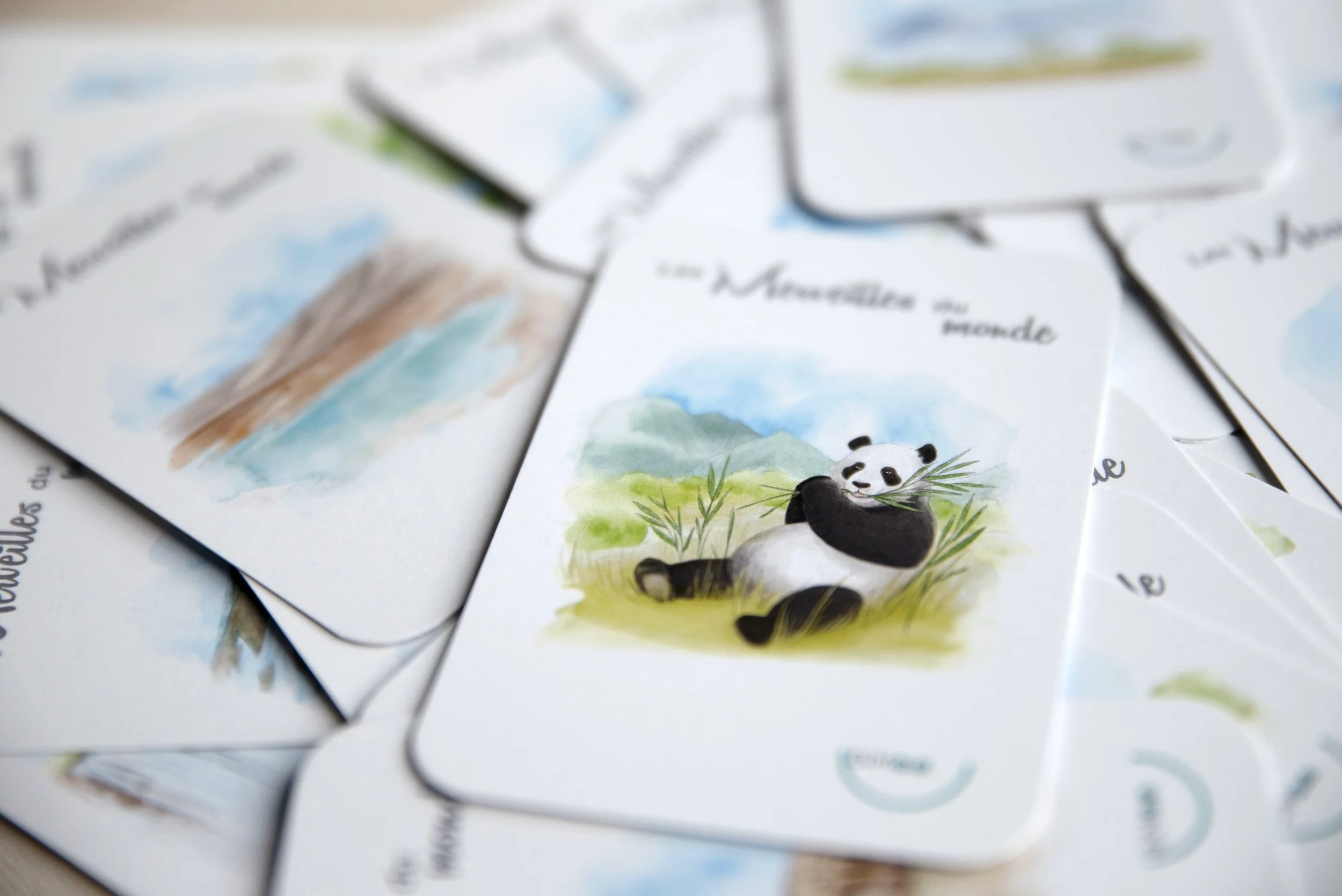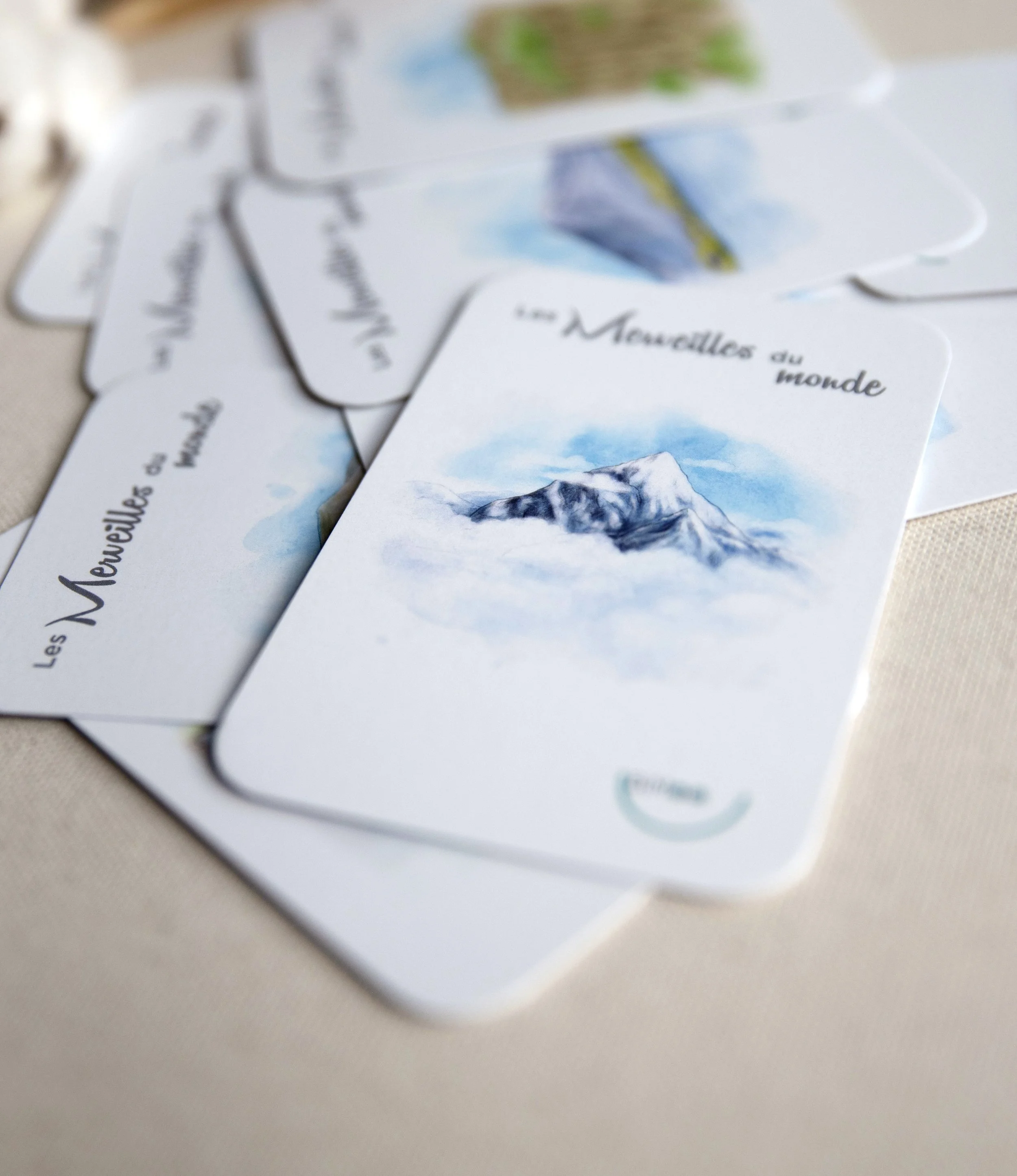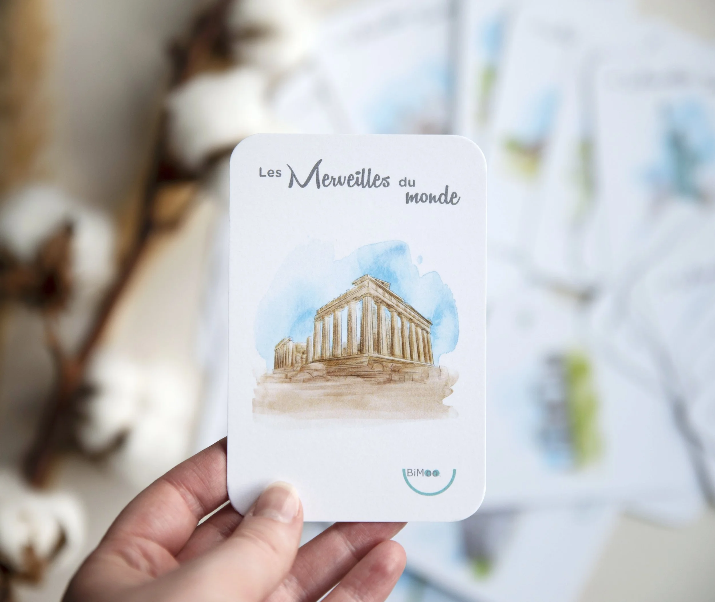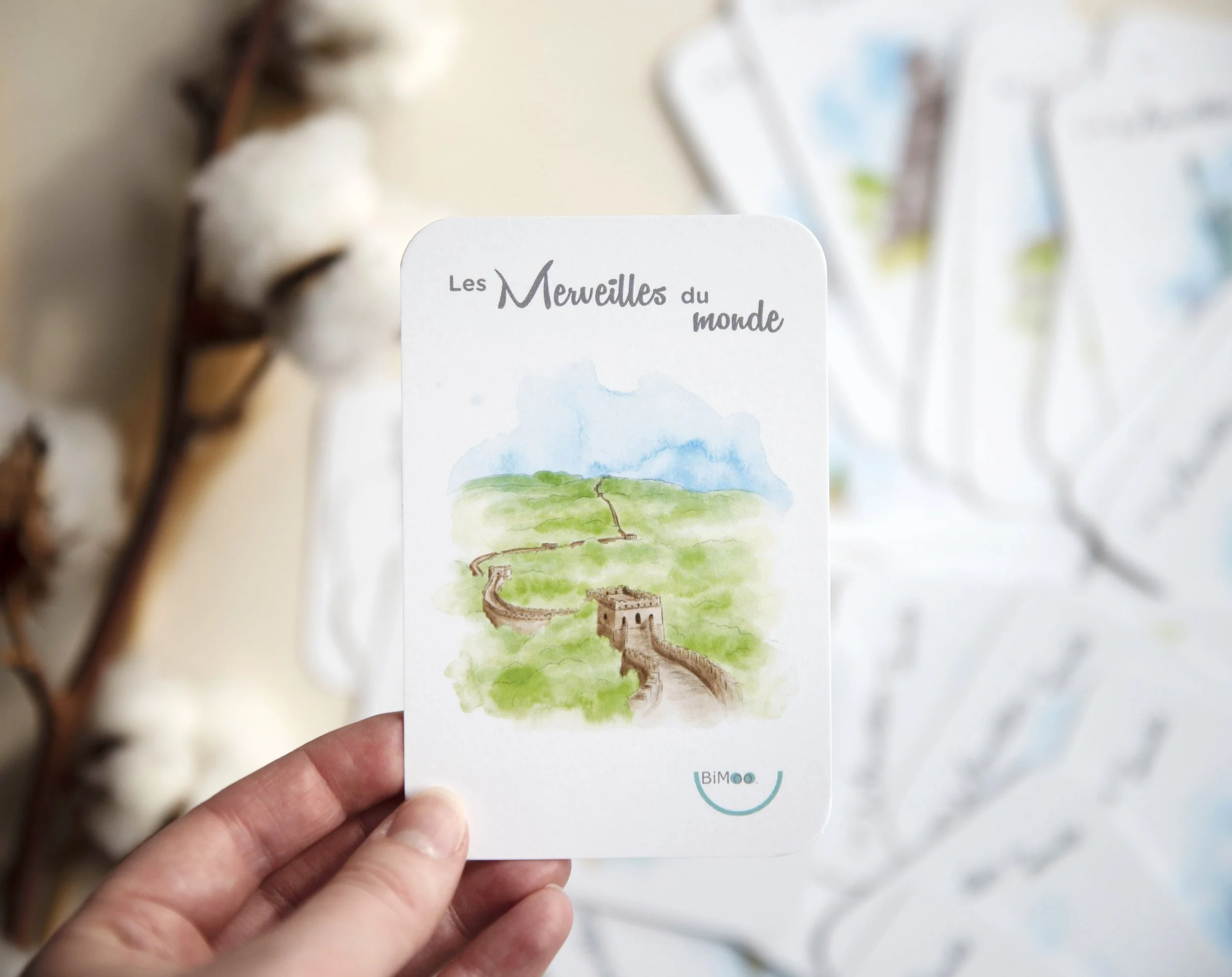 La magnifique entreprise québécoise Bimoo m’a contacté afin de produire des illustrations pour un jeux de cartes éducatif. Il fait la liste de 40 merveilles du monde. Ces cartes à jouer sont composées d’une jolie illustration puis, au dos ce trouve le descriptif de la merveille en question. Des heures de plaisir et de découverte!