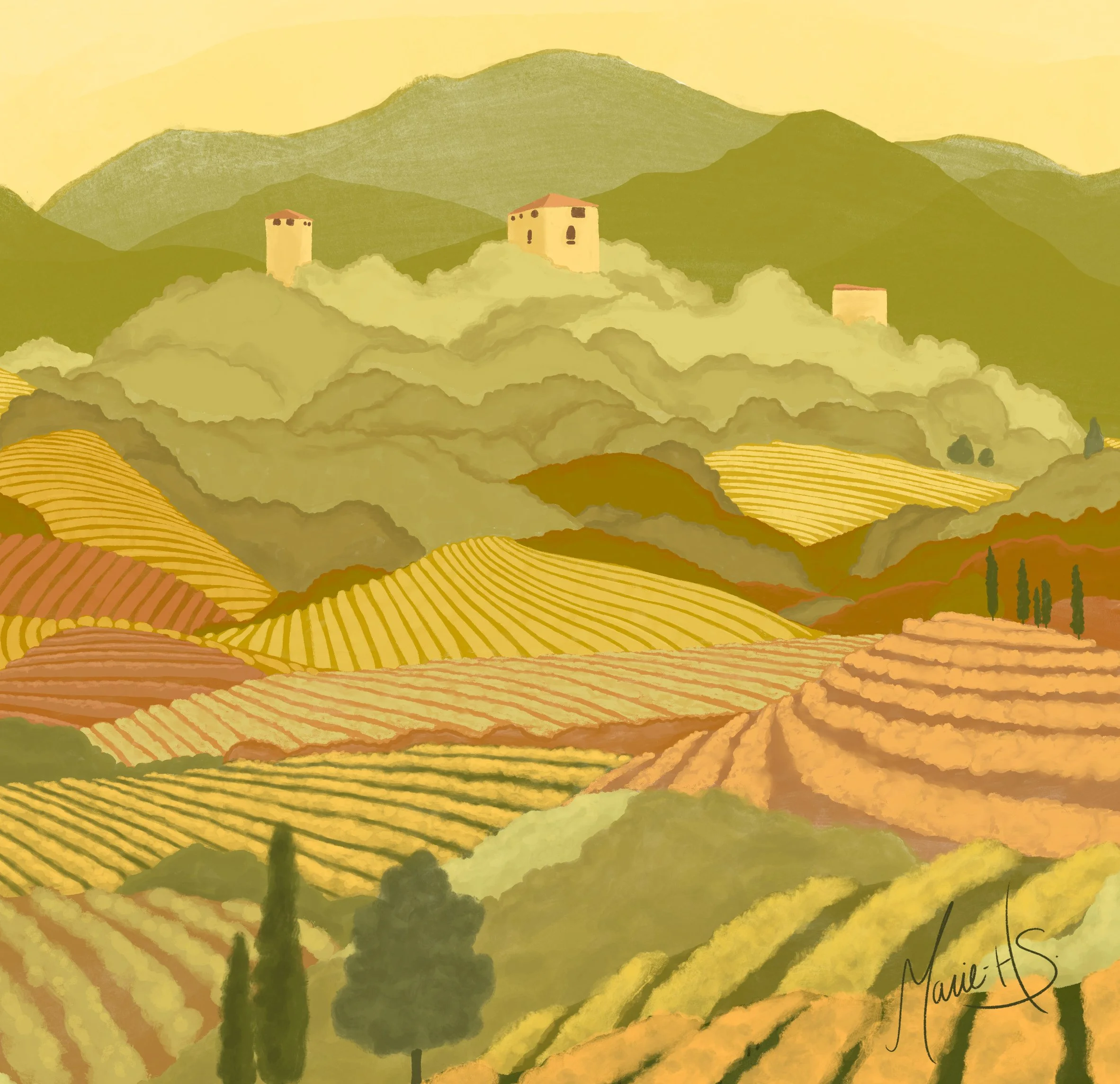 J’ai eu la chance de réaliser cette illustration pour Bambara Sélection: Un paysage pour le vin Perlage Pinot Grigio qui se retrouve sur la nouvelle étiquette.